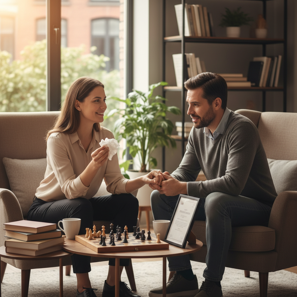 - Terapeuta dba o atmosferę zaufania i komfort rozmowy.