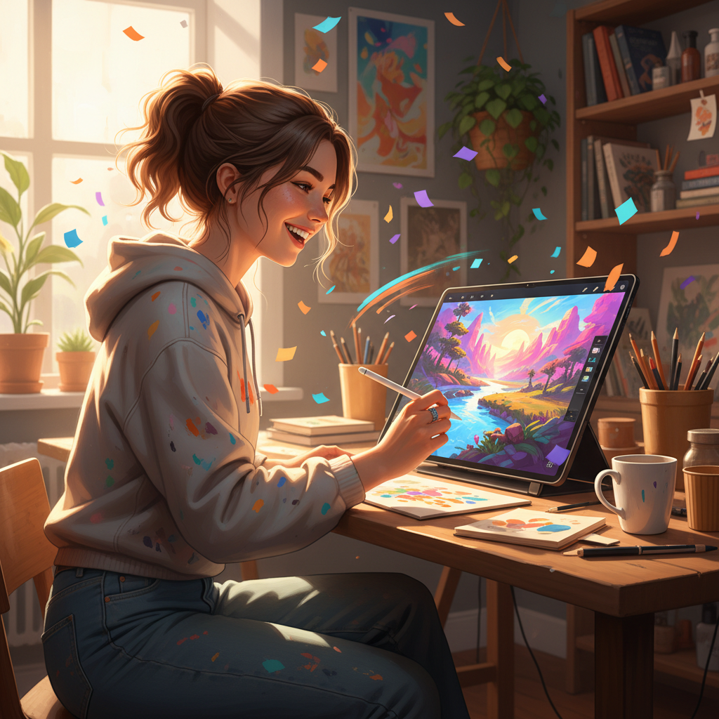 - Wypróbuj nowe narzędzia do kreatywności (np. cyfrowe malowanie, beatmaking).