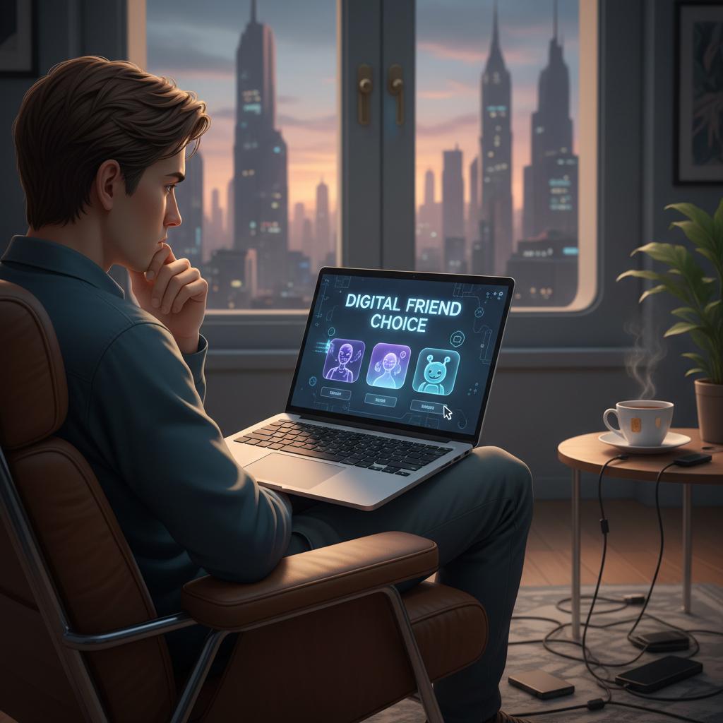 Zdjęcie: osoba testująca gotowość na cyfrową przyjaźń, słowo kluczowe: test cyfrowy kumpel, AI przyjaciel, decyzja.