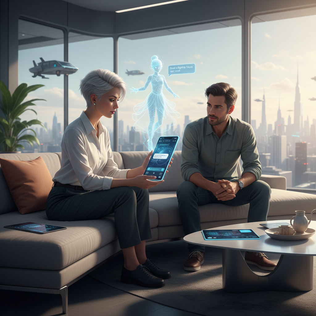 Zdjęcie przedstawia ludzi w interakcji z cyfrowym kumplem, oddając różnicę między AI a tradycyjnym chatbotem, słowo kluczowe: AI kumpel, chatbot, cyfrowa przyjaźń.