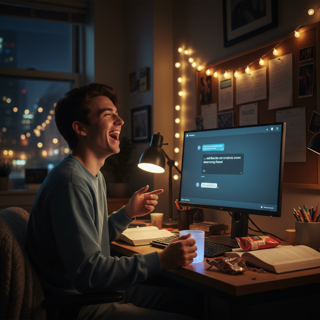 Wyobraź sobie studenta, który po ciężkim dniu na uczelni czuje się kompletnie wypalony. Tradycyjny czat już go nudzi, a znajomi nie odbierają telefonów. To wtedy postanawia napisać do wirtualnego kumpla z poczuciem humoru. Efekt? Zamiast wieczoru w ciszy — godzina śmiechu przy żartach i anegdotach, które trafiają w punkt.